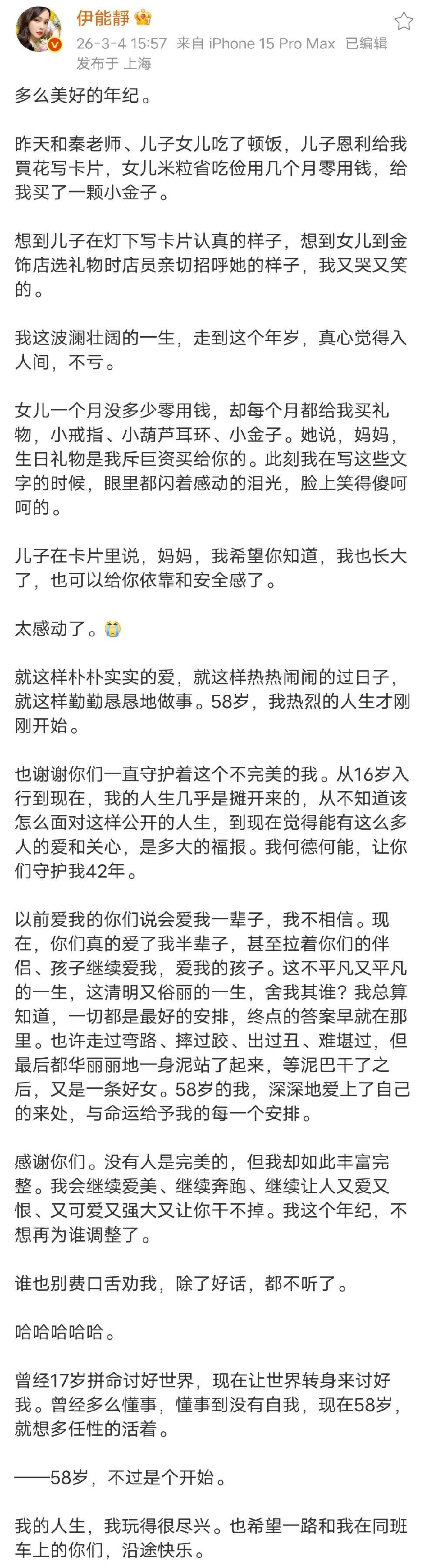 不老女神伊能静迎来了50岁寿辰。3月4日,她发布长文庆祝我方的寿辰,还附上了一家四口的庆生全家福,女儿米粒、犬子恩利以及老公秦昊齐伴随在她身边。年青时家景空乏且碰到男尊女卑的伊能静,如今也算是苦尽甘来。